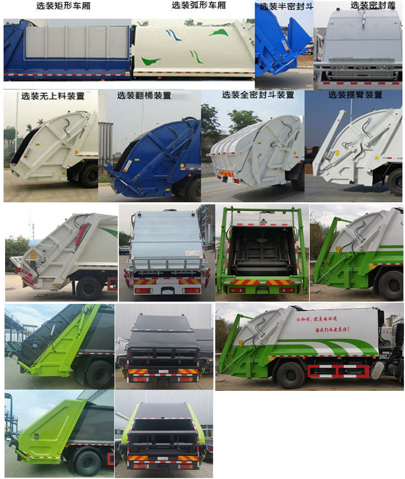 其它 | 1、該車主要專用裝置由箱體、壓縮系統組成,用于垃圾的收集與清運。該車可選裝方形或弧形箱體,選裝全密封蓋裝置,選裝方形擋泥板,選裝側防護連接結構件,選裝側防護樣式。選裝后部工作裝置。選裝多路閥位置,液壓油箱位置。選裝爬梯樣式;選裝工作裝置時外形長/前懸/軸距/后伸對應關系為(mm):①無上料裝置:8680/1400/4500/-,8710/1430/4500/-,8880/1400/4700/-,8910/1430/4700/- ;②全密封斗裝置和擺臂裝置:8880/1400/4500/200,8910/1430/4500/200,9080/1400/4700/200,9110/1430/4700/200;③翻桶裝置和翻斗裝置:9080/1400/4500/400,9110/1430/4500/400,9280/1400/4700/400,9310/1430/4700/400。僅采用4500mm,4700mm軸距。2、側防護采用冷彎型鋼/Q235,螺栓連接;后防護由專用裝置替代,下邊緣離地高:500mm。3、隨底盤選裝選裝高度不同的駕駛室;選裝前霧燈;選裝駕駛室頂部裝飾燈;選裝駕駛室前面罩;選裝前保險杠及前部燈具,選裝后視鏡;選裝后部燈具;選裝駕駛室前臉擾流罩;駕駛室臥鋪側窗選裝裝飾板,選裝后背式排氣管。安裝帶有衛星定位功能的行駛記錄儀。ABS型號/生產廠家:3631010-C2000/東科克諾爾商用車制動系統(十堰)有限公司,ABS 8/東科克諾爾商用車制動系統(十堰)有限公司, 4460046450/威伯科汽車控制系統(中國)有限公司,J ABS/焦作博瑞克控制技術有限公司。采用的發動機與油耗值對應關系為(L/100Km):DDi50E190-60/23.9,D4.5NS6B190/24.4,D6.7NS6B230/23.7,B6.2NS6B210/23.8,B6.2NS6B230/23.8。隨底盤選裝油箱位置。選裝箱體樣式,填裝器樣式。隨底盤選裝后處理、電瓶、尿素罐、備胎安裝位置。選裝油管布局. | ||